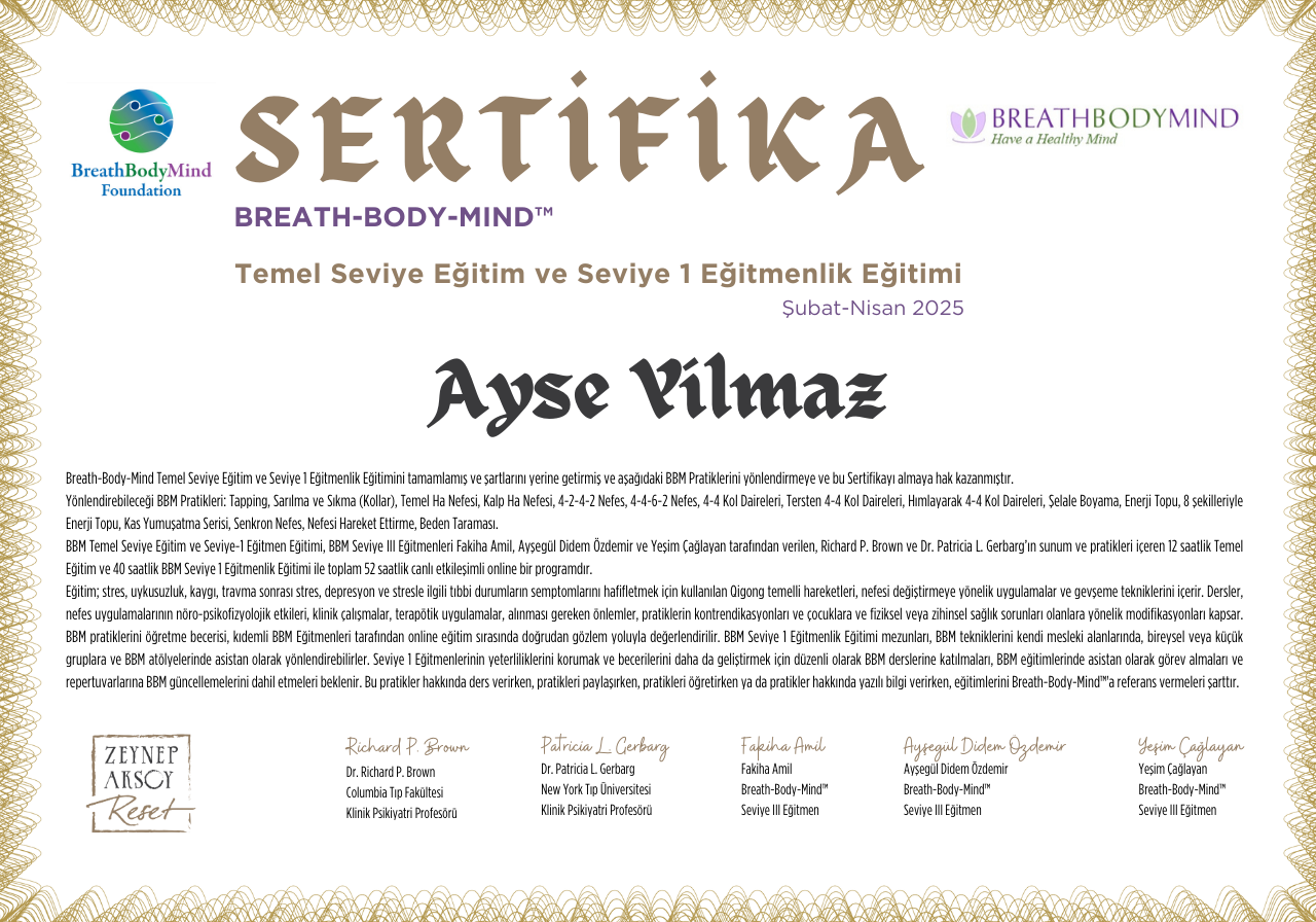 BBM Nefes Eğitimleri, modern bilim ile kadim nefes tekniklerini harmanlayan bütüncül bir yöntem sunar. Dr. Patricia Gerbarg ve Dr. Richard Brown’un rehberliğinde tasarlanan sistem, stres, kaygı, travma gibi durumlarda beden, nefes ve zihni yeniden dengelemeye odaklanır. Bu 52 saatlik eğitim, bireysel dönüşümünüzün yanı sıra, BBM Eğitmeni olarak, nefesin şifasını başkalarına aktarmanıza imkan sunar.