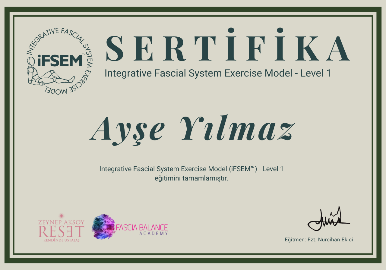 Fasyal sistemin derinlemesine farkındalığını geliştirmeye odaklanan bu bütüncül egzersiz modeli, fizyoterapist Nurcihan Ekici tarafından geliştirilmiştir. Her ay canlı Zoom üzerinden 6 pratik ve 1 teorik buluşmayla ilerleyen program, bedenin miyofasyal yapısına nazik ama etkili bir dokunuş sağlar; hareket kalitesini artırır, proprioseptif ve interoseptif duyarlılığı destekler, zihin–beden bağlantısını güçlendirir. Dersleri kaçırdığınızda kayıt üzerinden izleyebilir, modülleri kendi hızınızda uygulayabilirsiniz. Katılımcılar, programı tamamladıklarında iFSEM™ sertifikası almaya hak kazanır — bu yolculuk beden sağlığını nazik ama derin şekilde keşfetmek isteyen herkese açıktır.